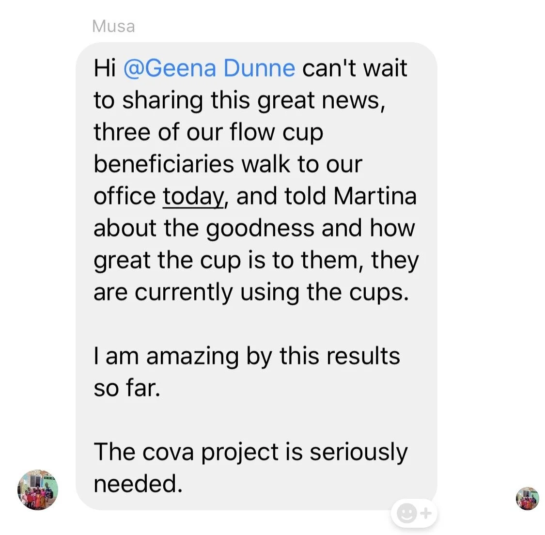 The feedback we've received since our distribution in April has been both positive and constructive and we continue to improve our projects. (See text message from Liberian Project Supervisor, Musa, two days after cups were first distributed.)
